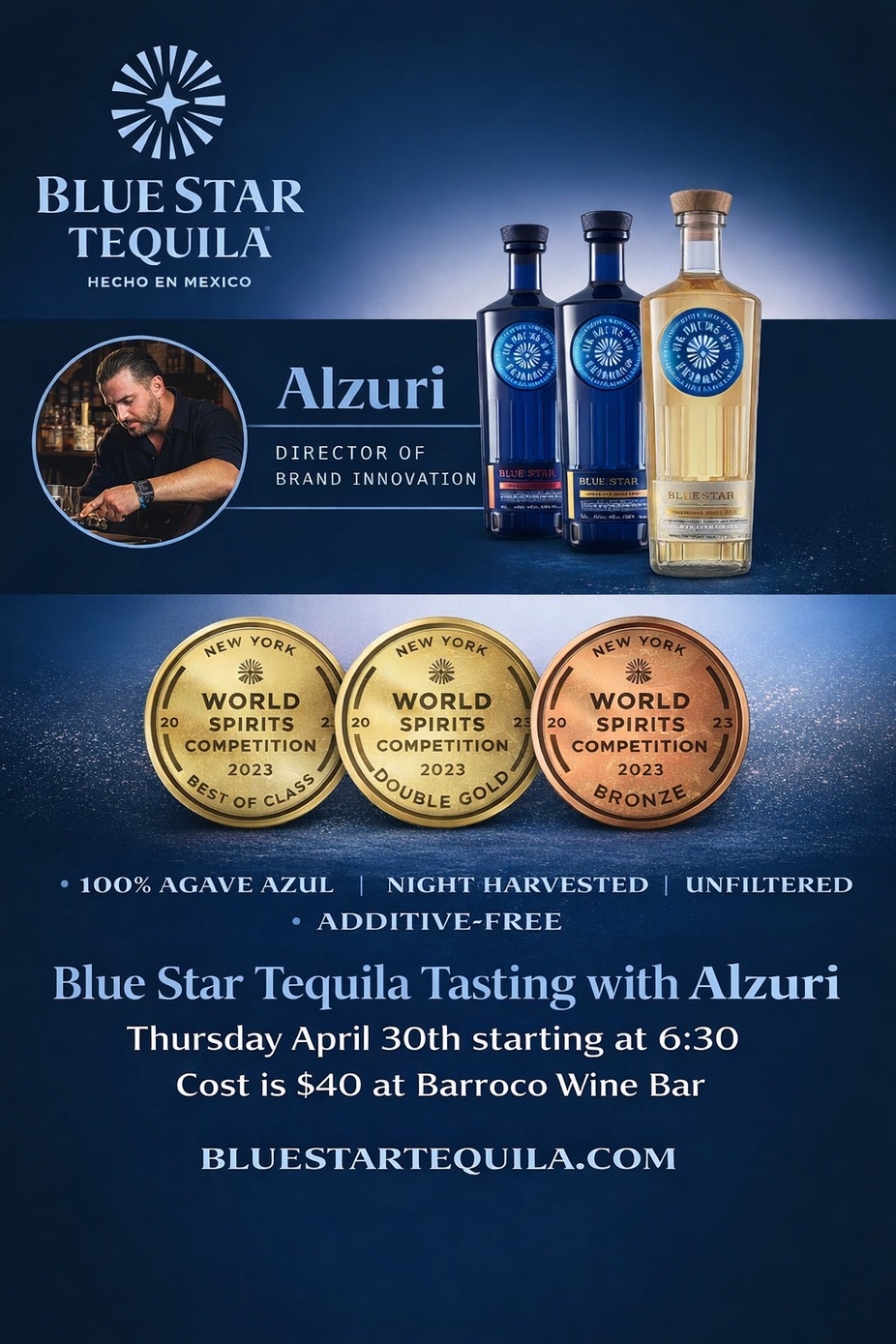 Blind Tasting of Four Blanco Tequilas Test your palate and see how Blue Star stacks up against other premium Blancos. No labels, no bias — just pure flavor.Vertical Tasting of Blue Star Expressions Explore the evolution of Blue Star Tequila from blanco through its aged expressions. Learn how time, barrel, and technique shape character and complexity.Mezcal Finale We’ll close with a beautifully crafted mezcal to highlight the key differences between tequila and mezcal — production, terroir, smoke, and tradition.Why You’ll Love It